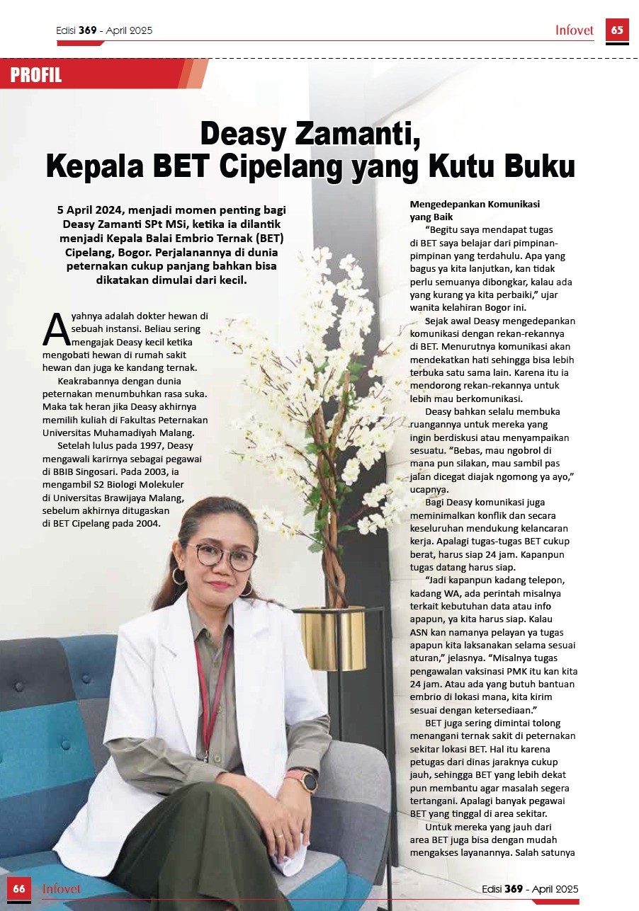 5 April 2024, menjadi momen penting bagi Deasy Zamanti SPt MSi, ketika ia dilantik menjadi Kepala Balai Embrio Ternak (BET) Cipelang, Bogor. Perjalananya di dunia Peternakan cukup panjang bahkan bias dikatakan dimulai dari kecil.