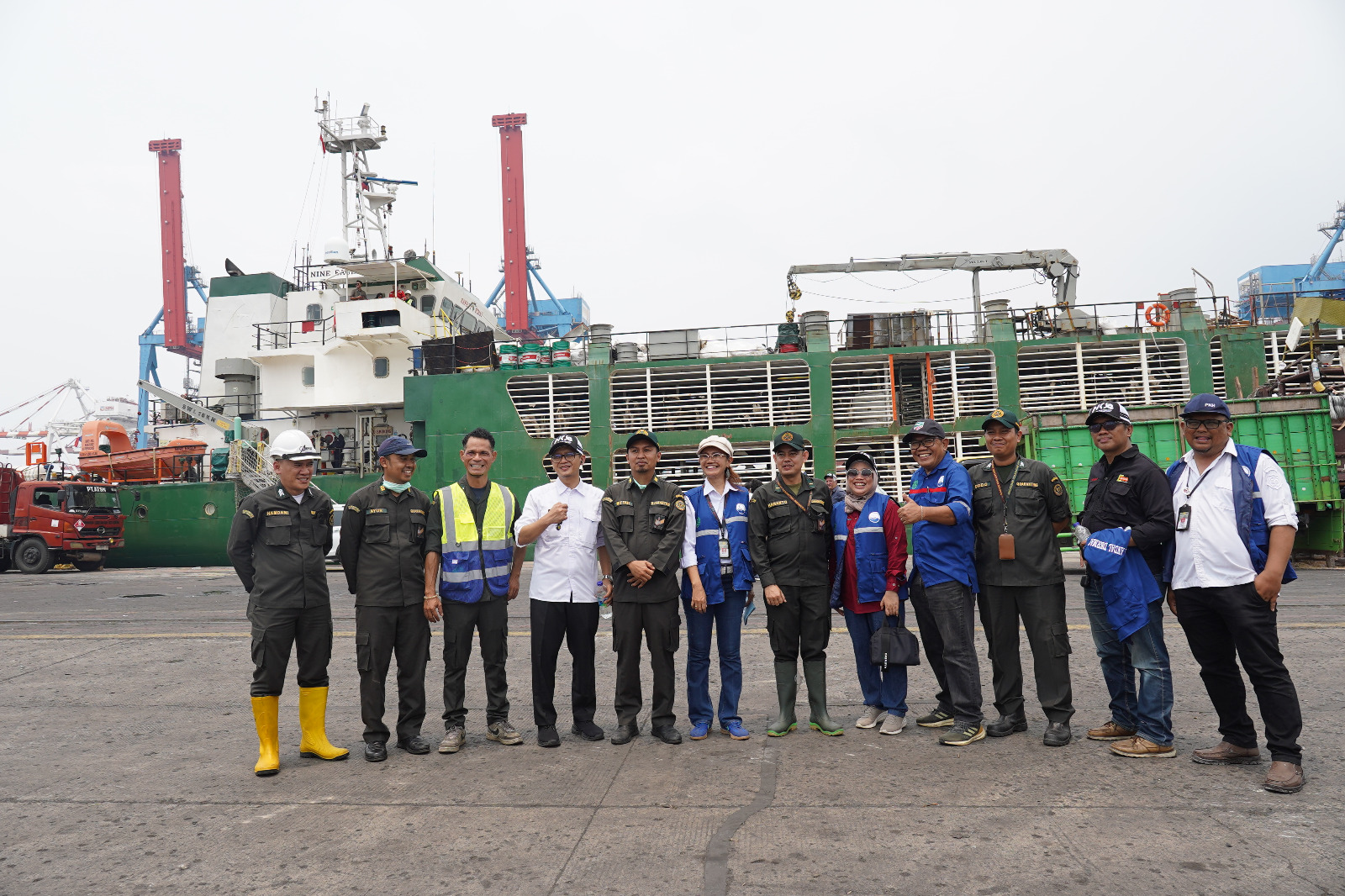 Jakarta, 17 September 2025. Bertempat di pelabuhan Tanjung Priok, Direktur Kesehatan Hewan drh. Hendra Wibawa,M.Si.,Ph.D mewakili Direktur Jenderal Peternakan dan Kesehatan Hewan, bersama kepala BET Deasy Zamanti,S.Pt.,M.Si. berkesempatan menyambut kedatangan sapi perah yang diimpor dari Australia.